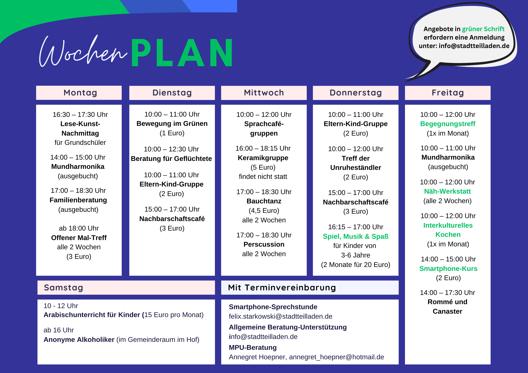 Entnehmen Sie die genauen Termine gerne unserem Programm. Sie können sich auch für unseren Newsletter anmelden unter: newsletter@stadtteilladen.de und erhalten von uns automatisch unser aktuelles Programm.