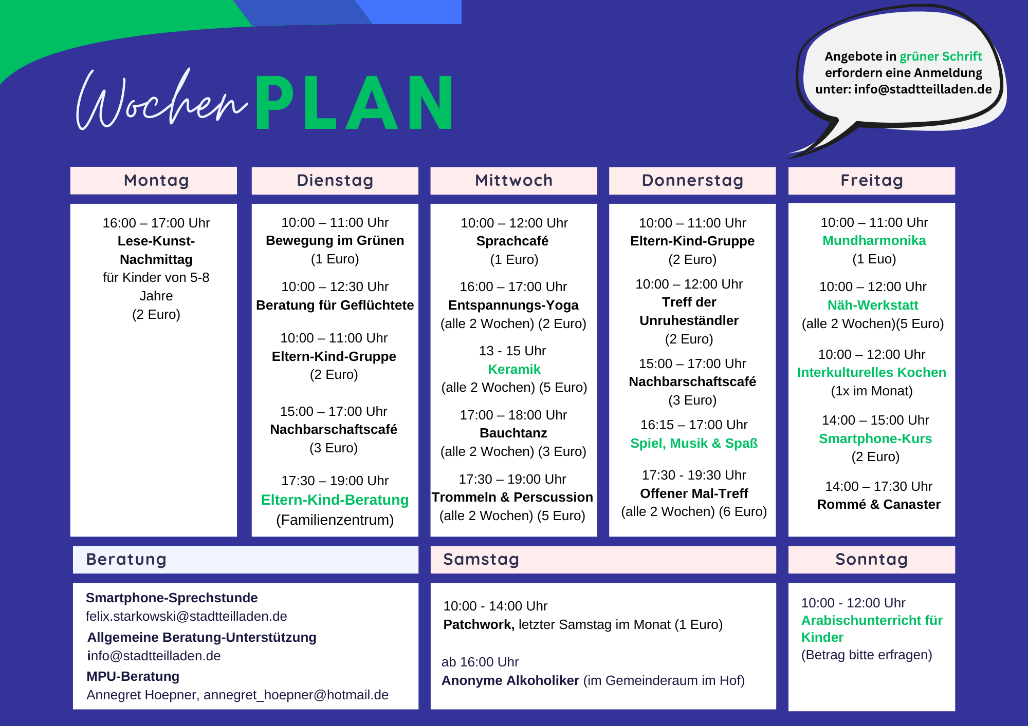 Zu den Angeboten im StadtteilLaden gehören Beratungs- und Unterstützungsangebote für alte und neue Bewohner*innen im Kirchsteigfeld sowie ein buntes Angebot an Gruppen für Familien, ältere Menschen, (Neu)Zugewanderte, Sportliche, Kreative und Spielbegeisterte. Darüber hinaus bietet der StadtteilLaden ein buntes Veranstaltungsprogramm.