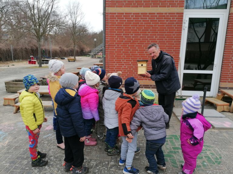 Herr Manfred Pohl besuchte den Kindergarten Sonnenblume. In seinem Gepäck hatte er einen Nistkasten für einen Baum in der Kita! Die Kinder hörten ihm gespannt zu, als er ihnen den Nistkasten genauer erklärte. Die Kinder konnten ihm auch von Vögeln in unserem Garten berichten. Gemeinsam wurde dann der Nistkasten an einer Birke aufgehängt. So können die Kinder die neuen Bewohner beobachten!