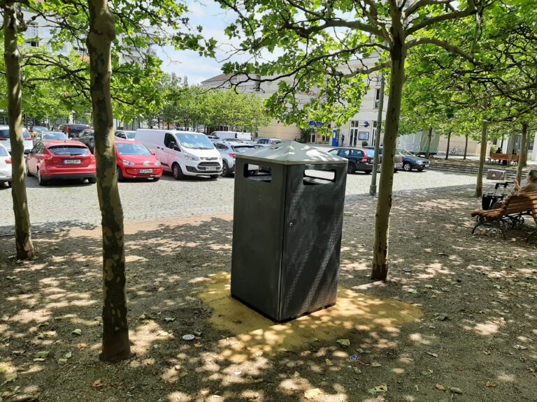 Am Heiner-Carow-Platz soll die Mülleimer ausgetauscht werden. Da die alten Mülleimer sich nach unten öffnen lassen, liegt immer wieder der Müll herum.